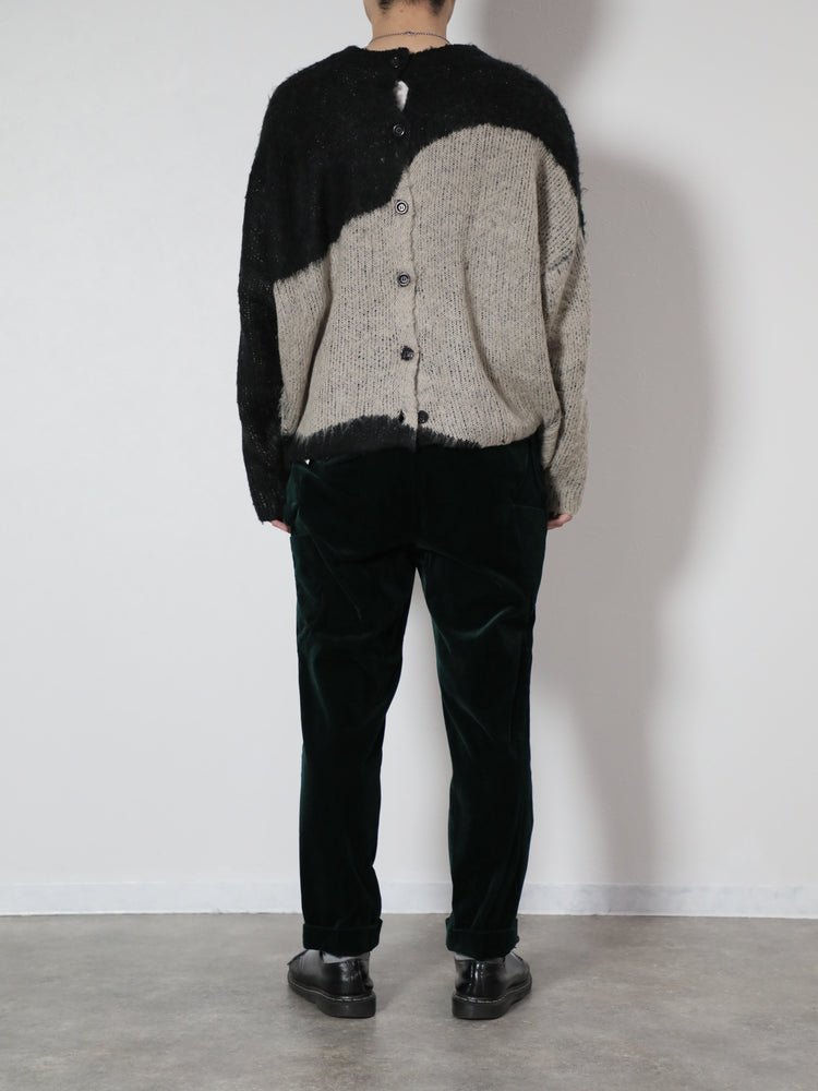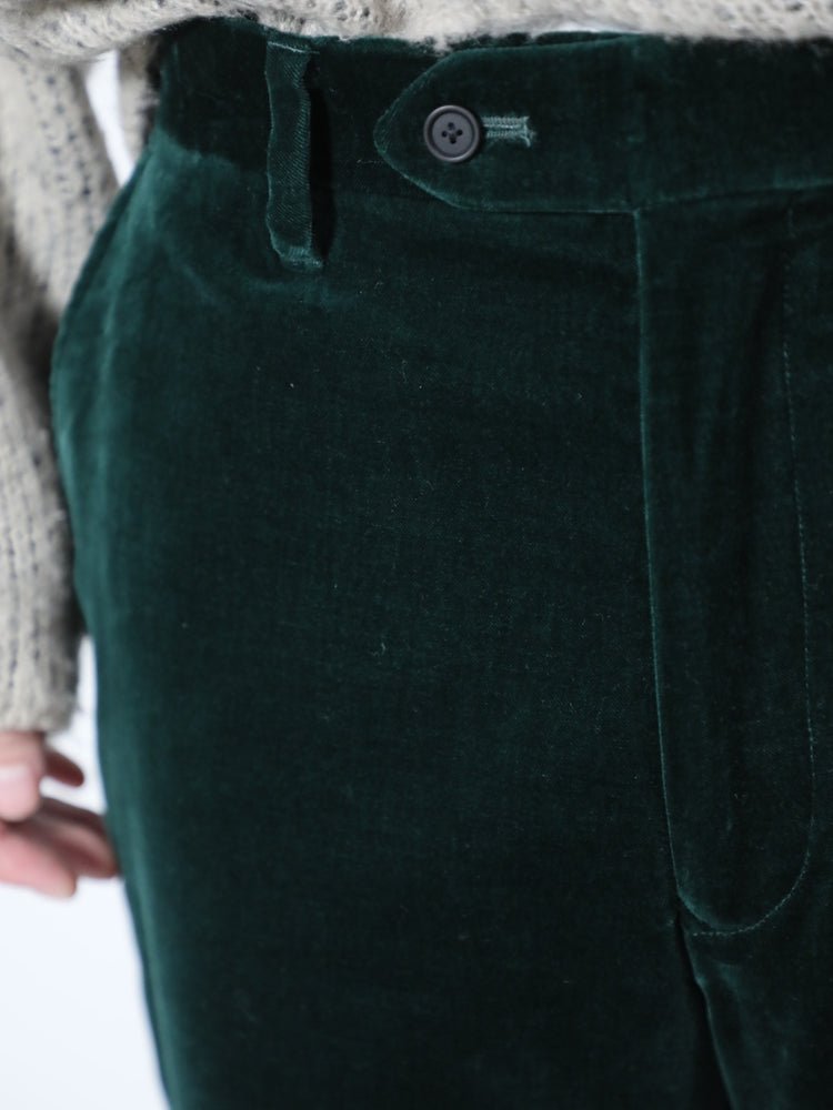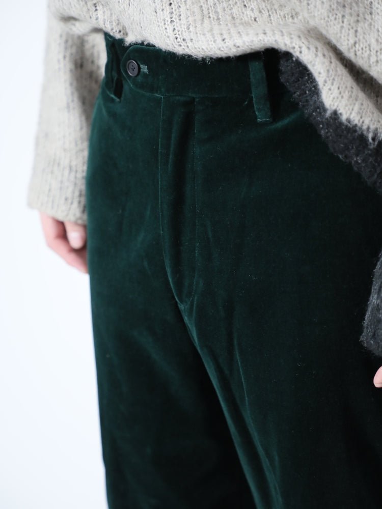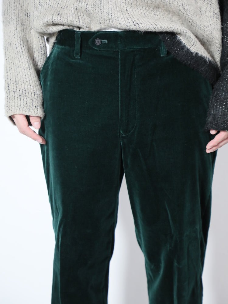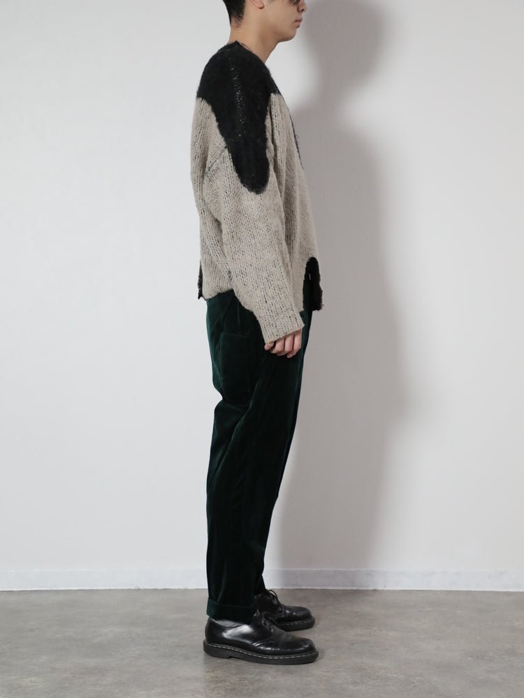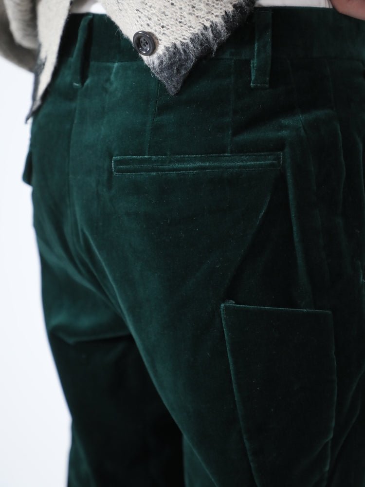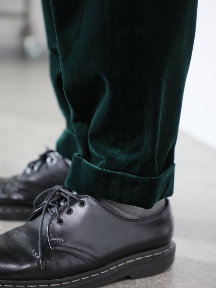 太ももの部分にはペインターパンツに見られるハンマーフックをあしらい、綺麗なベロアパンツとの対比が面白い。