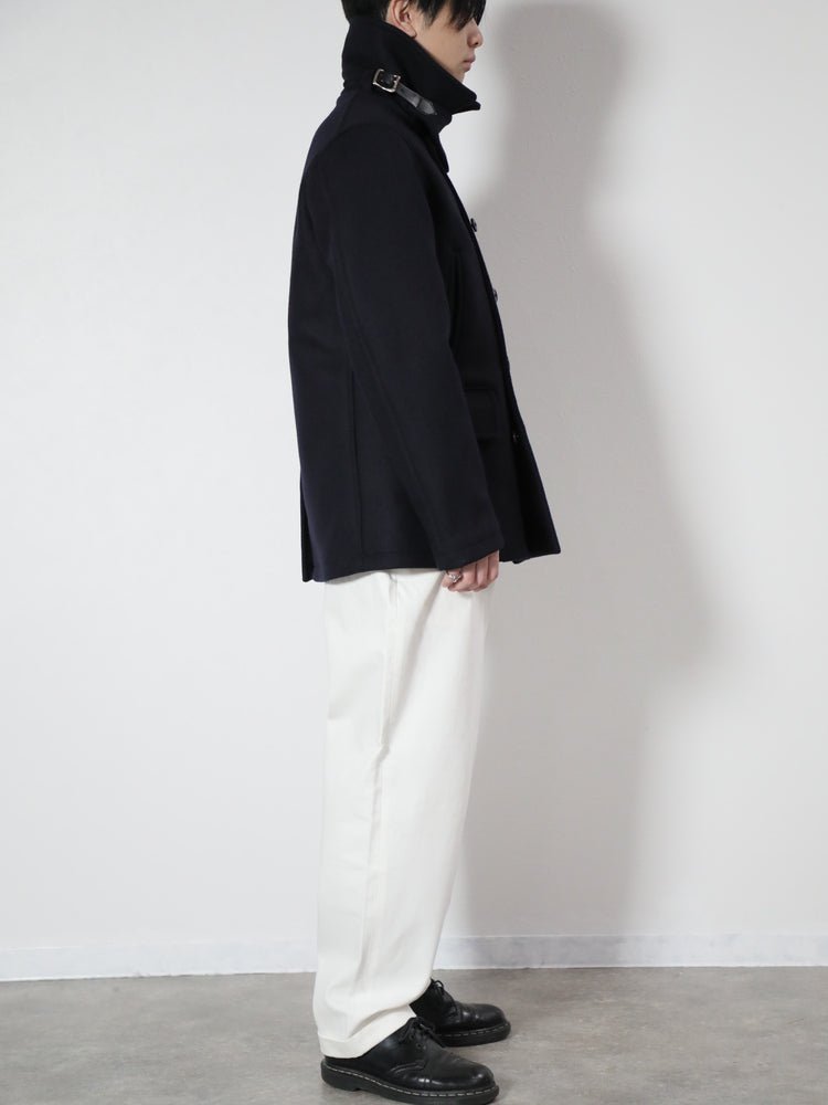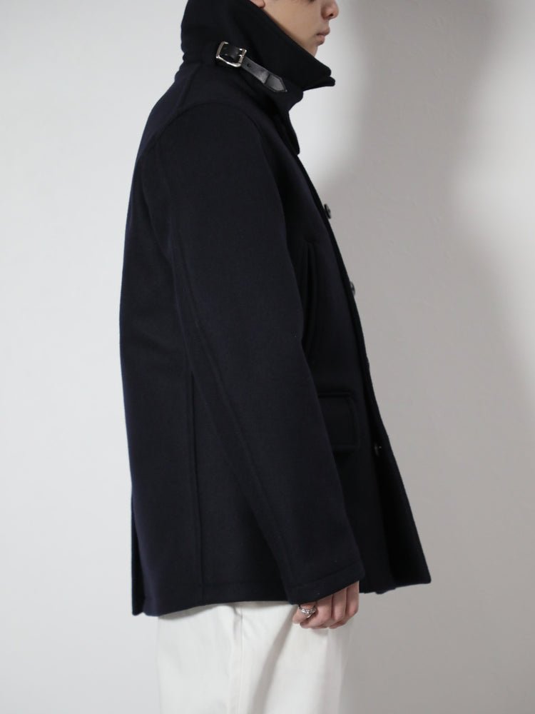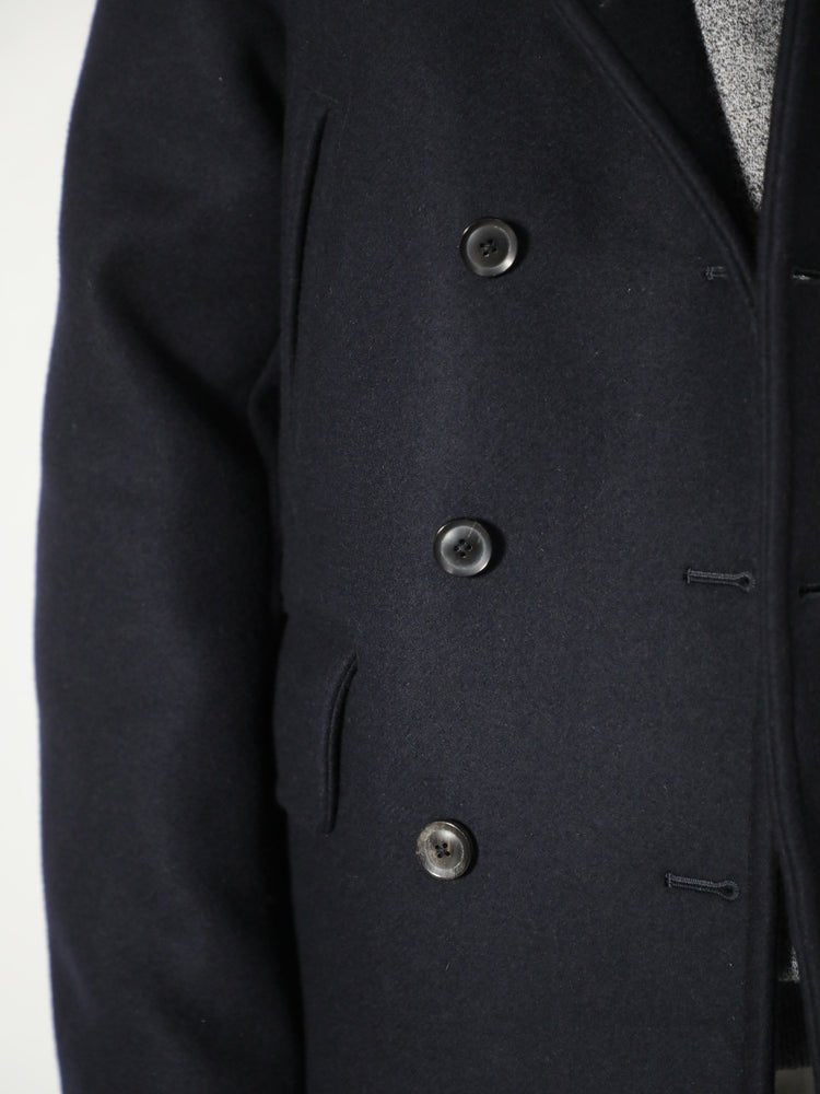 しっかりと厚みのあるメルトン素材。深いネイビーは普遍的にお使いいただけます。コート下の大きめなフラップポケットに加えて、上部にも両玉縁でスリットポケットを。すっとポケットへ手を入れることが出来、アクセスがスムーズです。